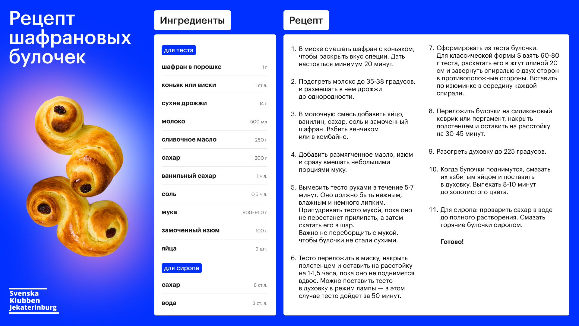 Самый любимый зимний десерт Швеции — шафрановые булочки. По-шведски они называются Lussekatter, люсийские котики, и традиционно пекутся на День Святой Люсии, 13 декабря. Шведский клуб, который уже много лет проводит свои мероприятия в БЦЕ, делится рецептом булочек, проверенным участниками клуба.